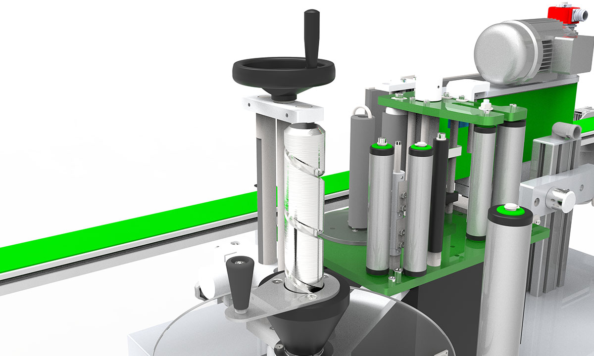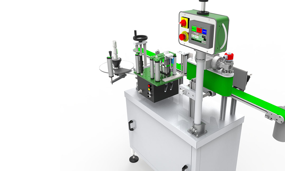 Equipo de etiquetado para la aplicación de una etiqueta y/o contraetiqueta en envases cilíndricos. Etiquetadora económica teniendo en cuenta sus altas prestaciones. Equipada con dos cabezales DMC – Ecoline, adaptable en producción y velocidad a cualquier linea de envasado.
