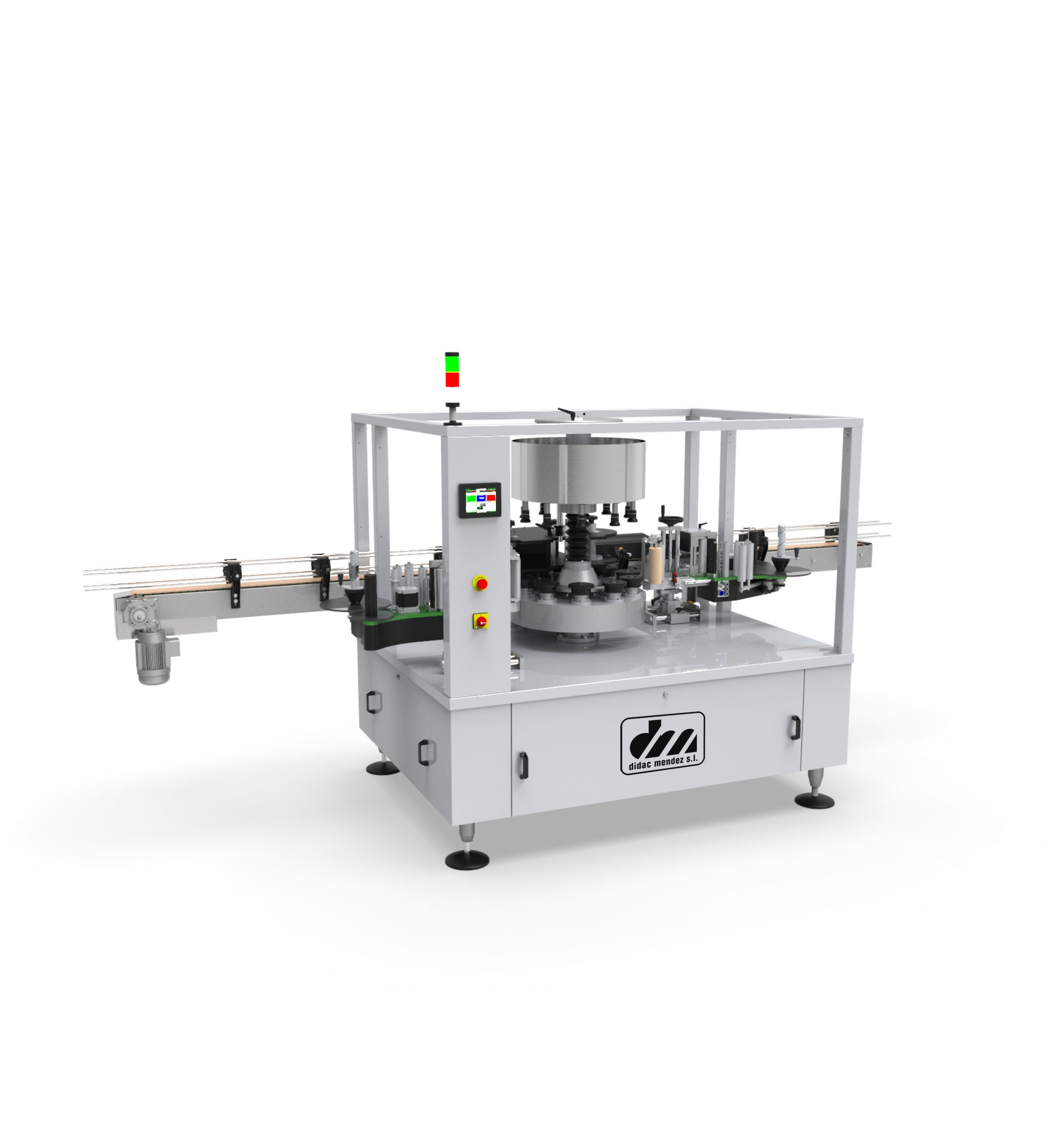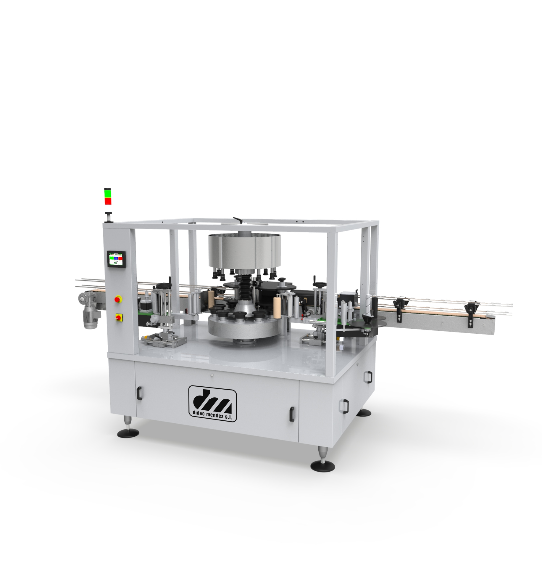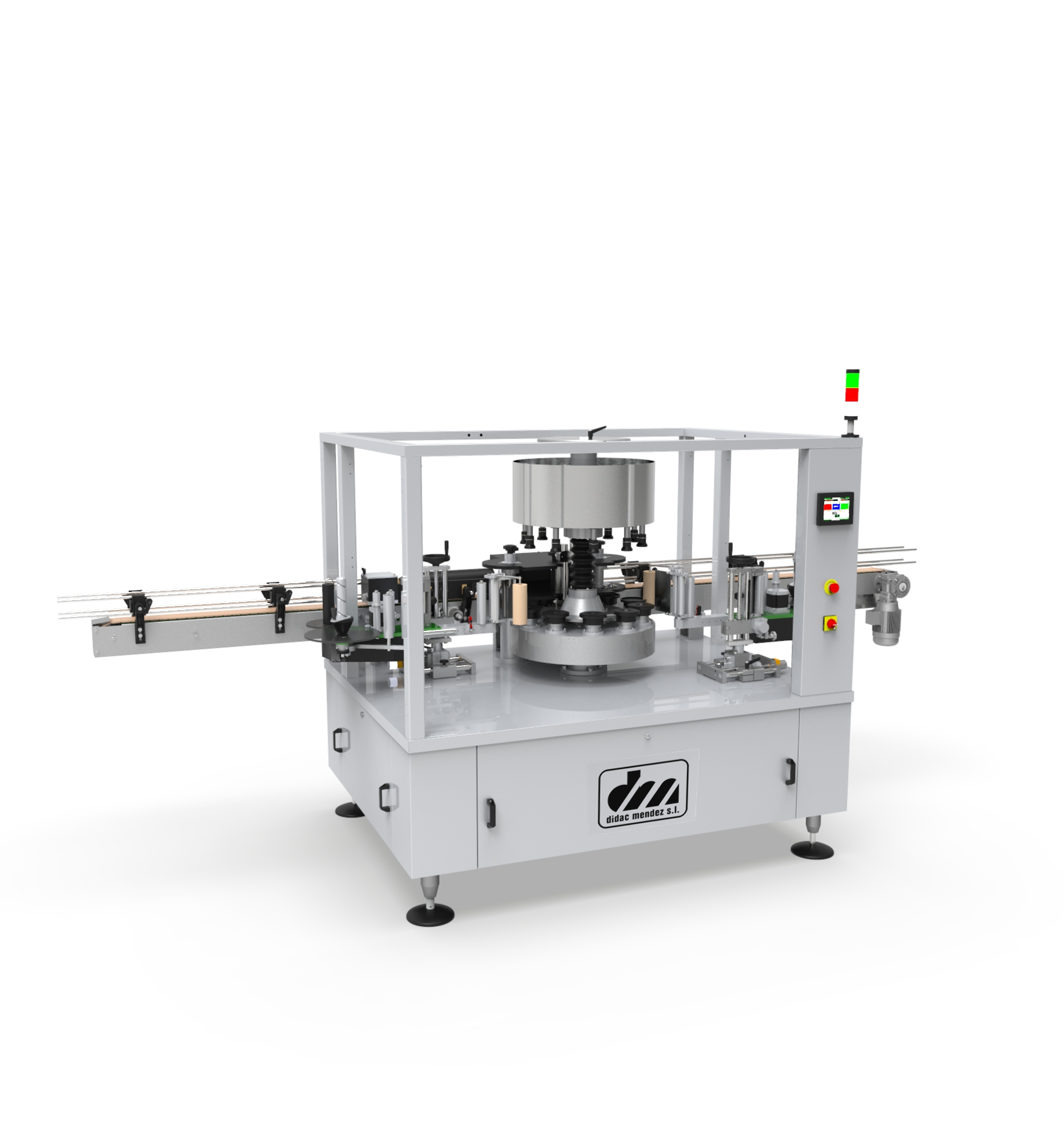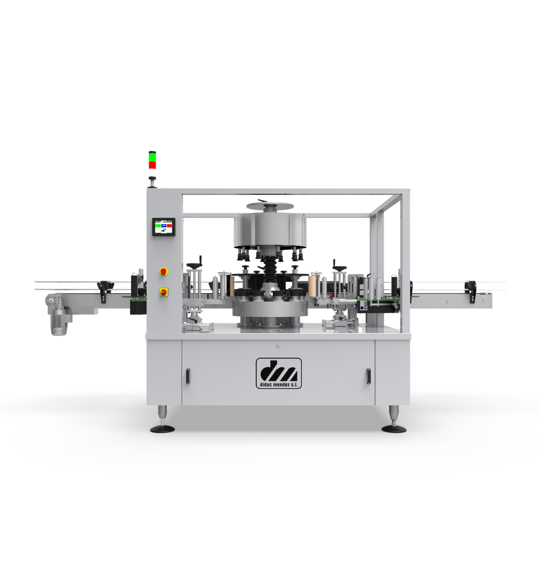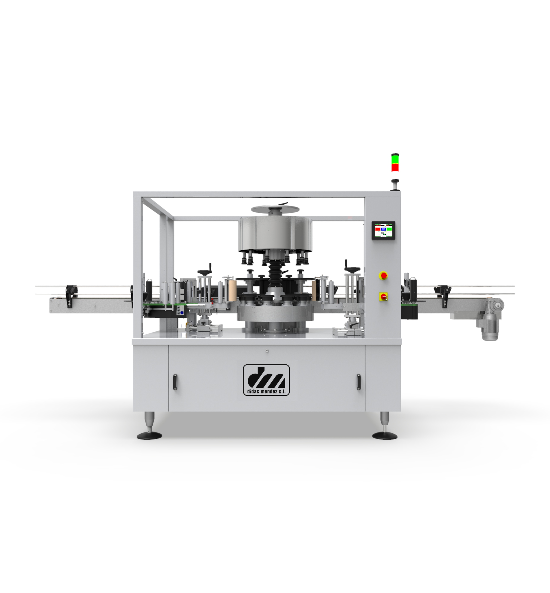Las etiquetadoras rotativas Didac Méndez están desarrolladas para líneas de producción de gran volumen, donde la velocidad y la precisión son críticas. Su sistema rotativo permite la aplicación simultánea de etiquetas en varias botellas, acelerando el proceso y garantizando un posicionamiento preciso de la etiqueta en cada envase.